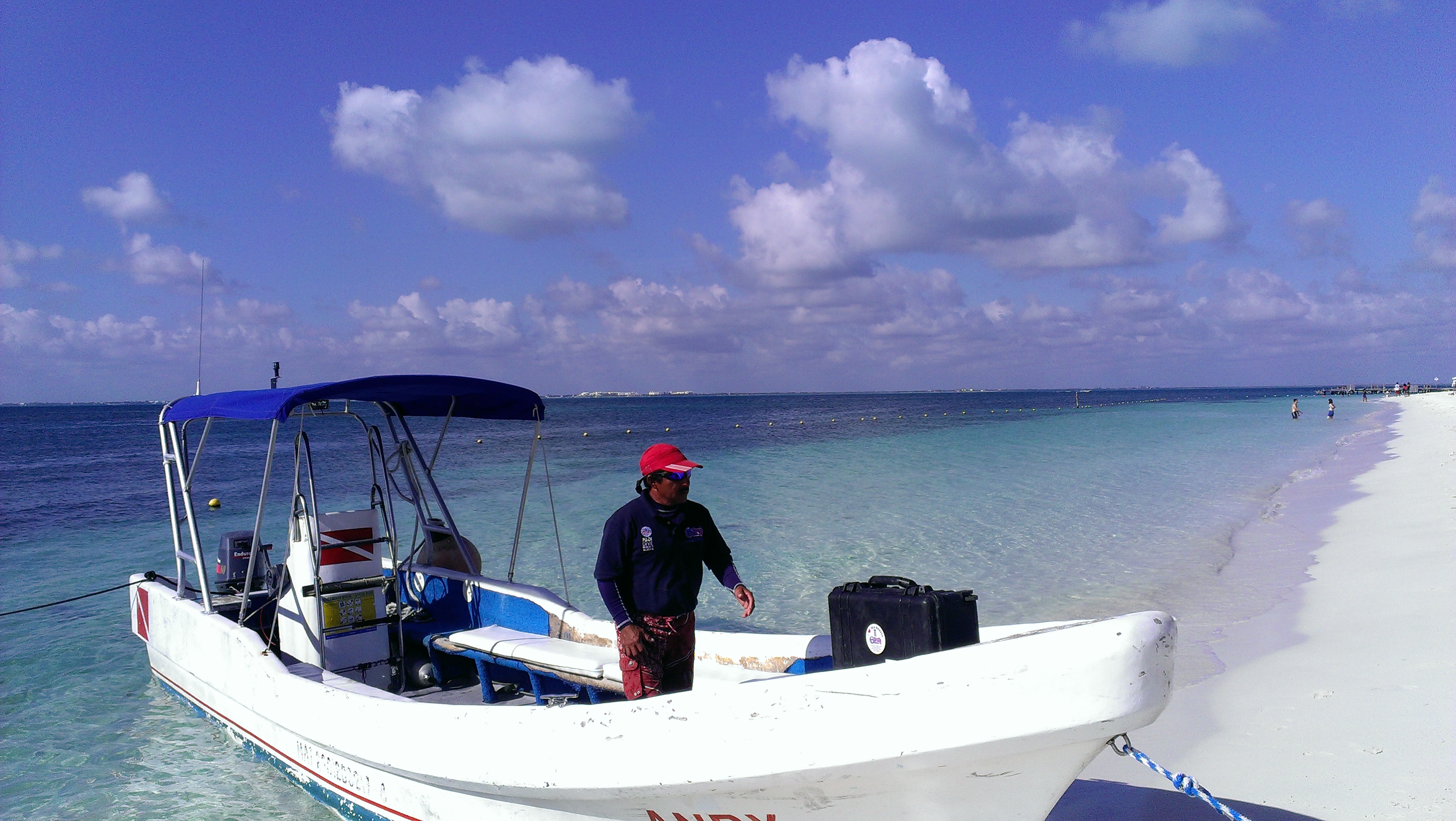 이슬라무헤레스에서도 다이빙을 한 번 했습니다. 사진은 다이버들이 오기 전 해변에서 배를 점검 중인 깨삐딴 님.
